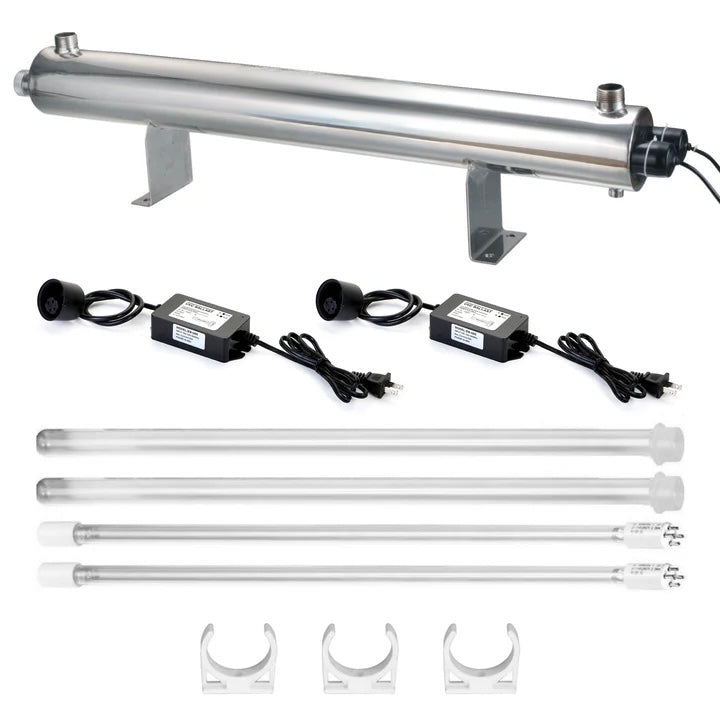 COMPLETE SYSTEM: Includes Mounting Clamps, Quartz Sleeves, UV Bulbs, and Ballasts. Easy installation, no plumber needed. Horizontal or vertical installation. LED Working / Non-working Indicator